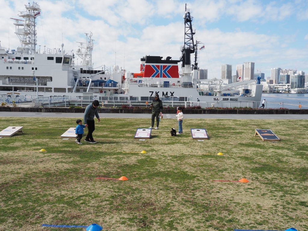他にもコーンホールというアメリカでは人気のゲームも体験できるコーナもあり、大人から子供まで楽しくプレーしていました。