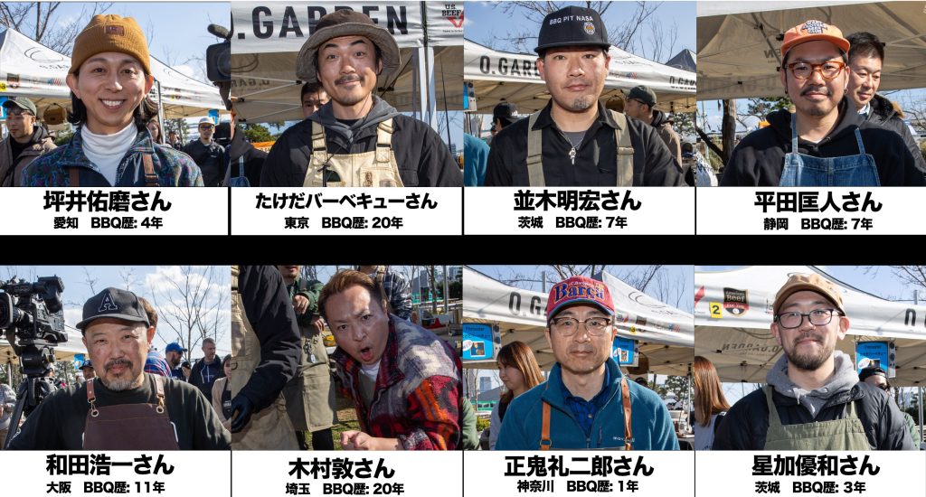 8人のピットマスターはBBQ歴1〜20年と幅広いがみなさんBBQにかける情熱は変わらない。